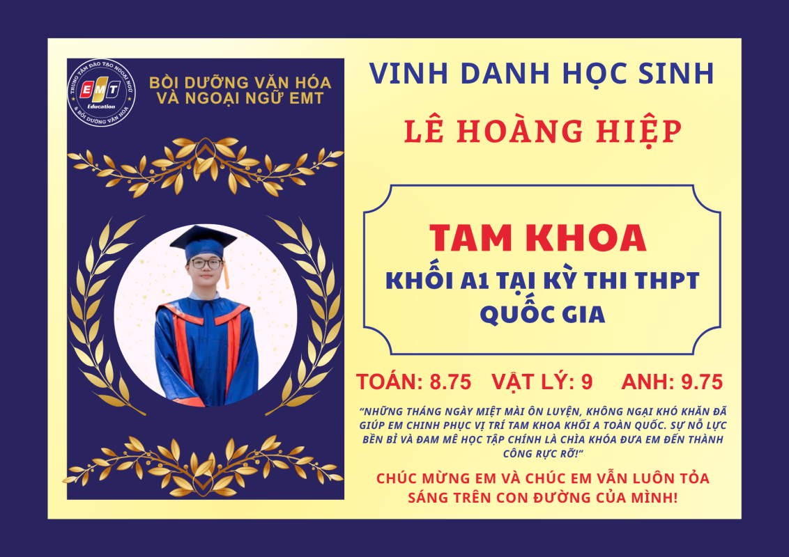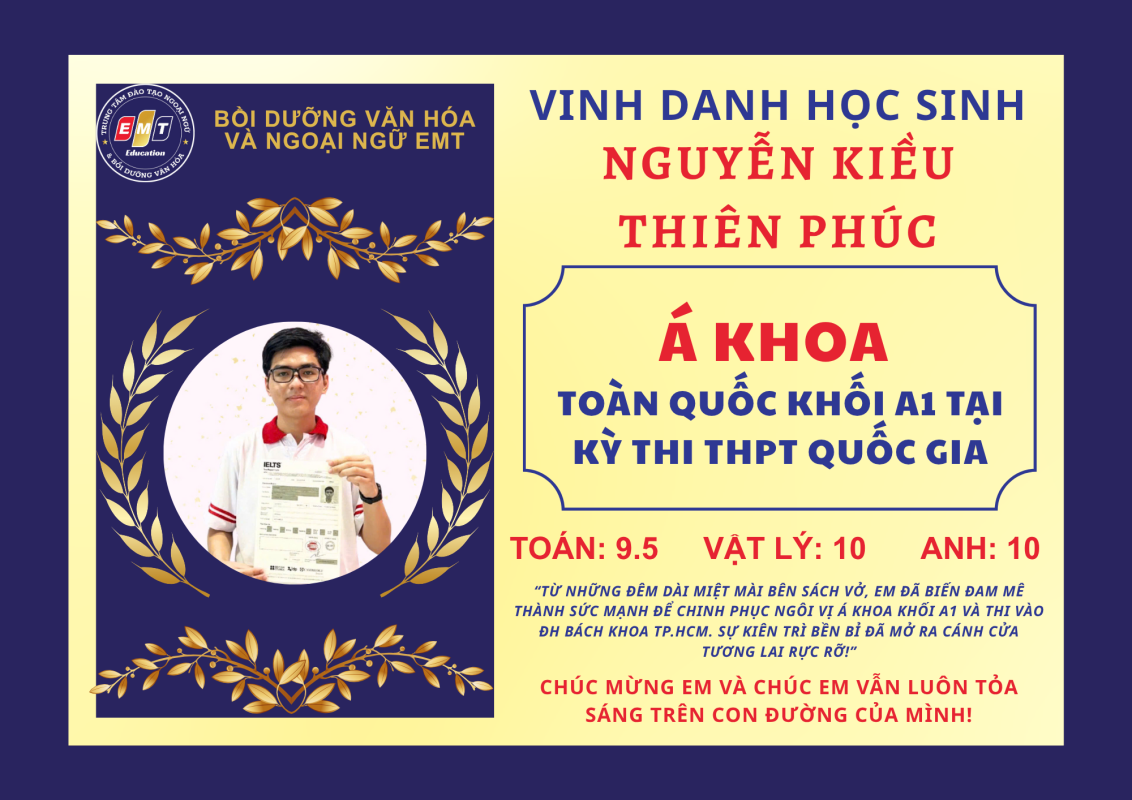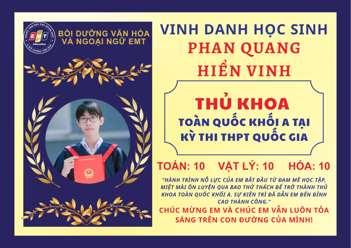 EMT ACADEMY tự hào đã bồi dưỡng được nhiều học viên xuất sắc – những minh chứng sống động cho hệ thống bồi dưỡng văn hóa toàn diện của chúng tôi, đồng hành cùng con bạn chinh phục các kỳ thi học sinh giỏi quốc gia và xây dựng nền tảng vững chắc cho tương lai rực rỡ.