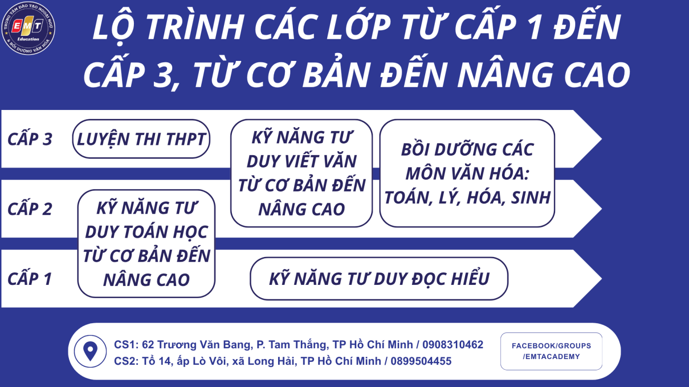 EMT ACADEMY cung cấp lớp luyện thi cấp 3 chuyên sâu, tập trung củng cố kiến thức trọng tâm và kỹ năng làm bài, giúp học sinh tự tin đạt điểm cao trong kỳ thi THPT Quốc gia.