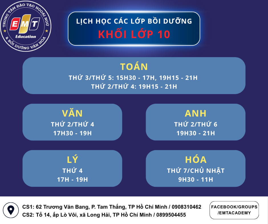 EMT ACADEMY cung cấp lớp luyện thi vào lớp 10 chuyên sâu, tập trung kiến thức trọng tâm và kỹ năng làm bài, giúp học sinh tự tin đạt điểm cao trong kỳ thi tuyển sinh cấp 3.