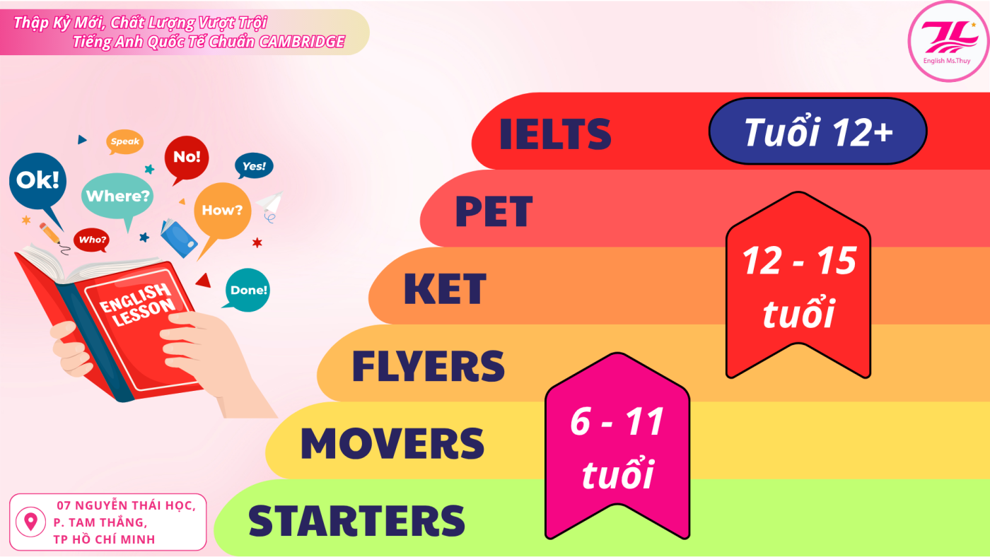 Lớp luyện thi Cambridge tại EMT ENGLISH tập trung chiến lược ôn luyện chuyên sâu cho các kỳ thi Young Learners (Starters, Movers, Flyers) và KET/PET, giúp học sinh từ tiểu học đến THCS tự tin chinh phục chứng chỉ quốc tế với kỹ năng toàn diện.