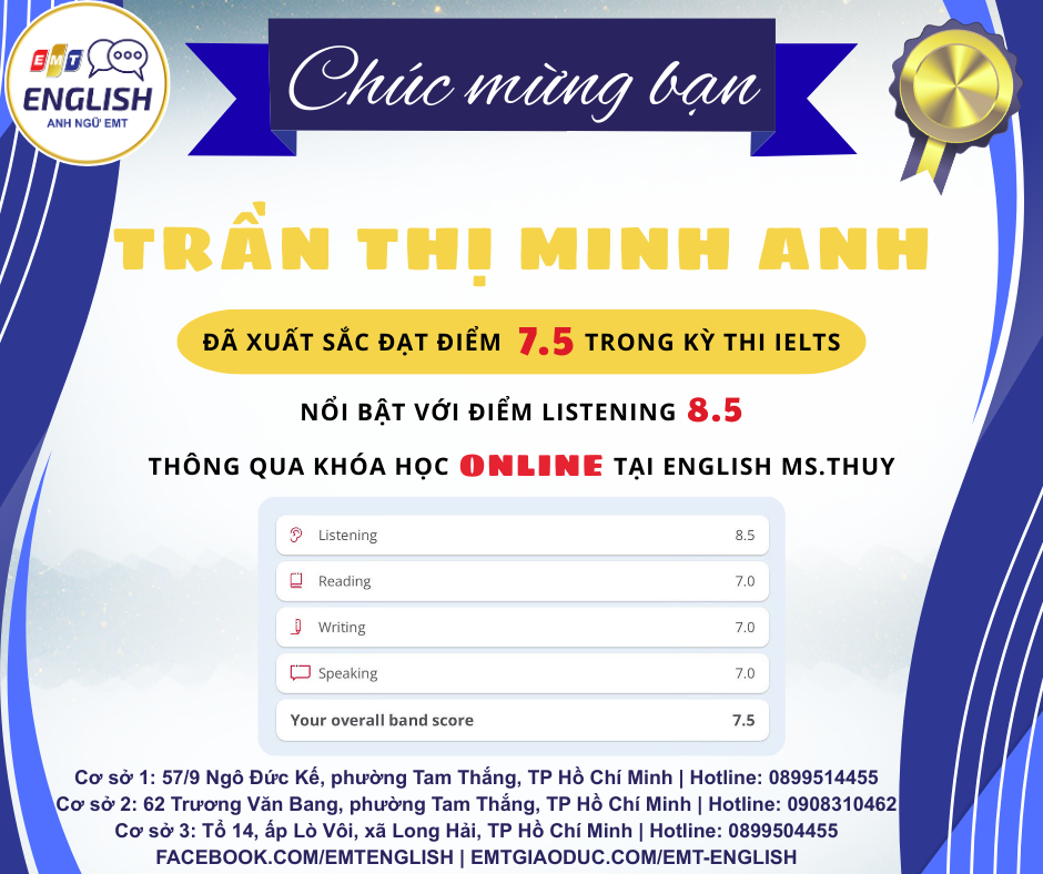 EMT SmartStep tự hào đã đào tạo nhiều học viên xuất sắc, chinh phục thành tích cao trong các kỳ thi tiếng Anh quốc tế chỉ qua những buổi học trực tuyến linh hoạt, khẳng định sức mạnh của giáo dục mọi lúc mọi nơi.