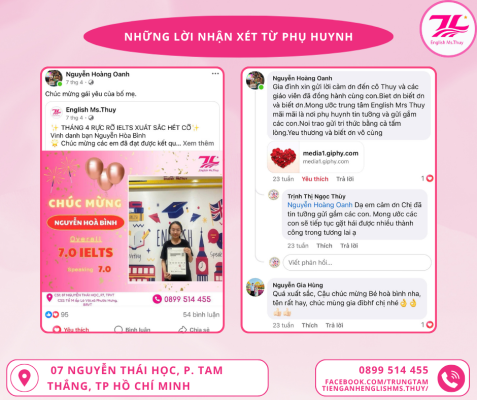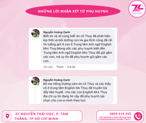 Mình rất cảm ơn các cô, trong quá trình các con học thì các cô rất là quan tâm theo sát từng bước, nếu con không học thì cô cũng nhắc nhở. Các cô luyện đề cho các con rất là nhiều, nói chung là con tiếp thu rất là tốt. Qua đây thì mình rất cảm ơn trung tâm English Ms.Thuy đã ủng hộ cho con của mình và theo sát con.
