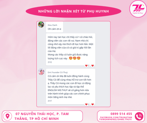 Tất cả học viên được học ở English Ms.Thuy buộc phải xuất sắc, ở đó không có sự lười viếng, mà phải tự giác học, học và học. Học trong sự tự giác, yêu thích và đam mê. Phụ huynh hãy gửi con em mình đến với trung tâm English Ms.thuy chắc chắn con quý vị sẽ tiến xa hơn những gì quý vị mong ước. Biết ơn, biết ơn và mãi mãi biết ơn cô thầy.
